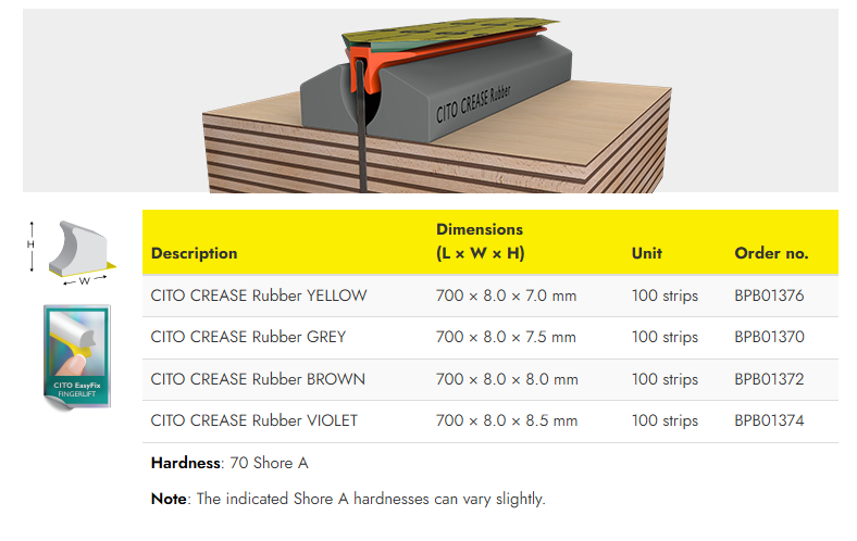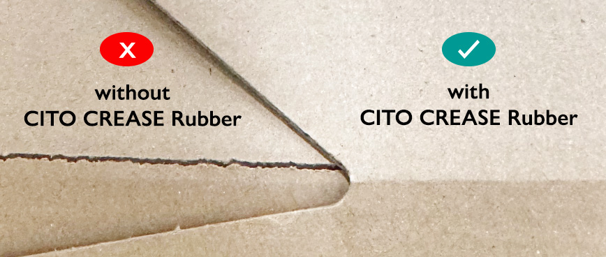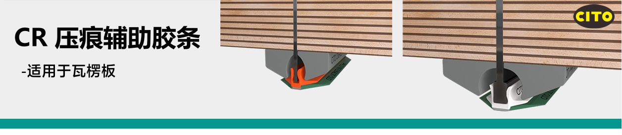 CITO CR 压痕辅助胶条 CITO CR 压痕辅助胶条是一款专为瓦楞纸板压痕工艺研发的特殊型材,可适用于顺瓦楞与逆瓦楞的压痕应用。 该型材可用于各种瓦楞类型及不同厚度的材料,不会造成纸板过度压碎。无论是 90° 折叠还是 180° 折叠,都能有效支撑压痕过程。直接贴附在压痕线处使用,可实现精准压痕,防止面纸破裂及喇叭口。其独特的几何结构可与压痕槽完美配合,确保压痕力的最佳传递。 CITO CR 压痕辅助胶条的独特设计已申请欧洲专利。 | |